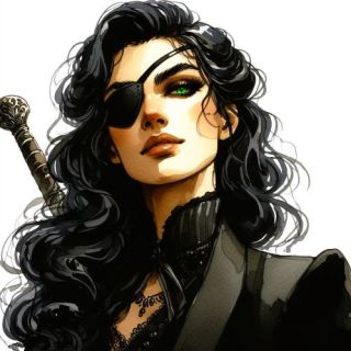 Description: She carries herself with an indomitable swagger, steel in the line of her back and silk in the sway of her hips. At about five-foot-nine, she has the lithe, strong frame of a lifelong athlete, her svelte curves lending a sensuous softness to the whipcord grace of her lean and rippling musculature. Jet-black hair tumbles down her back in a riot of glossy curls and waves, complementing the rich olive-gold of her blessedly unblemished complexion. Her left eye is the deep, lustrous green of the clearest emerald, ever glittering beneath a veil of ebon lashes, while her right remains covered by an eyepatch inscribed with the gauntlet of House Pravus. The sculpted symmetry of her features speaks of elite heritage, from the high angle of her cheekbones to the elegant slope of her nose, but the latent fire in her one eye and the incendiary smiles on her full lips suggest something altogether tameless.